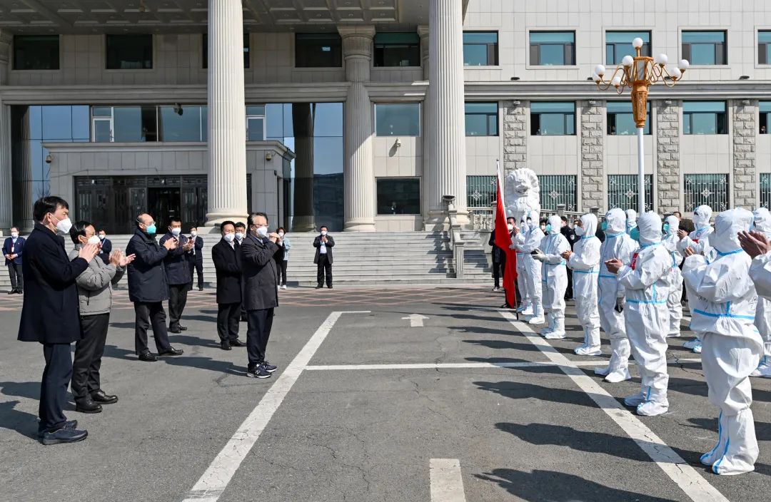 4月14日,省委书记景俊海到长春市实地检查指导疫情防控、复工复产等工作,为圆满完成包保支援任务的通化工作队送行。
