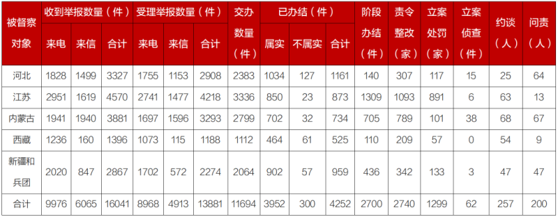有关省(区)和兵团高度重视督察工作,将督察作为坚决贯彻习近平生态文明思想的重要内容,作为推动高质量发展的重要契机,主要领导通过督察动员、现场督办、召开专题会议等方式,大力推动整改落实。截至4月25日,各督察组共收到群众来电、来信举报16041件,受理有效举报13881件,经梳理合并重复举报,累计向相关省(区)和兵团转办11694件。相关省(区)和兵团已办结或阶段办结6952件。其中,立案处罚1299家,立案侦查62件;约谈党政领导干部257人,问责党政领导干部200人。