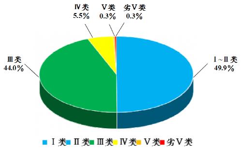 2022年1―3月,全省主要流域总体水质为优。监测的375个断面中,Ⅰ~Ⅲ类水质比例93.9%,其中Ⅰ~Ⅱ类水质比例49.9%。各类水质比例如下:Ⅰ类占2.4%,Ⅱ类占47.5%,Ⅲ类占44.0%,Ⅳ类占5.5%,Ⅴ类占0.3%,劣Ⅴ类占0.3%。小流域考核断面Ⅰ~Ⅲ类水质比例为88.1%。