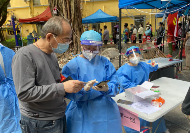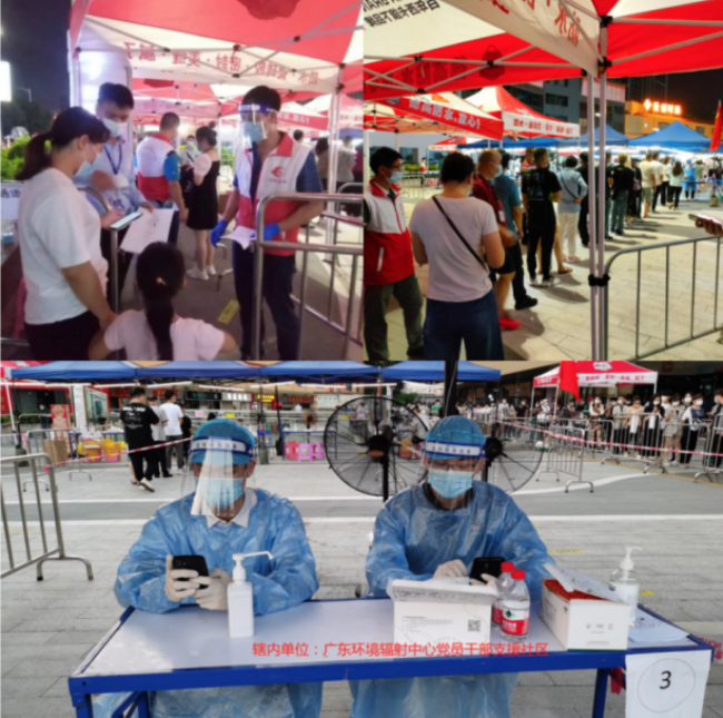 4月11日晚,省环境辐射监测中心党总支共组织5名职工协助凤阳街道和平社区开展核酸检测工作,负责现场秩序维持、指引受检人员登记和录入信息、提供志愿服务等。