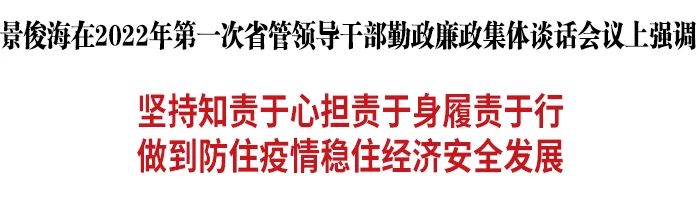 5月6日,2022年第一次省管领导干部勤政廉政集体谈话会议以视频形式召开。省委书记景俊海出席会议并讲话。他强调,要深入贯彻习近平新时代中国特色社会主义思想,坚持知责于心、担责于身、履责于行,做到防住疫情、稳住经济、安全发展,奋力夺取疫情防控和经济社会发展双胜利。