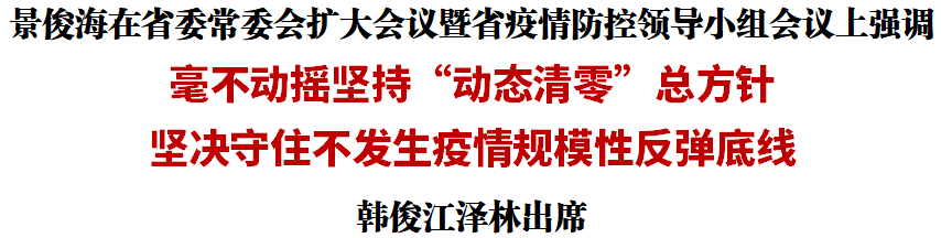 5月6日,省委书记景俊海以视频形式主持召开省委常委会扩大会议暨省疫情防控领导小组会议,传达学习中共中央政治局常务委员会5月5日会议精神,听取我省疫情防控工作汇报,研究部署我省贯彻落实举措。景俊海强调,要深入学习领会、坚决贯彻落实习近平总书记重要讲话精神,深刻、完整、全面认识党中央确定的疫情防控方针政策,毫不动摇坚持“动态清零”总方针,以时不我待的精神、分秒必争的行动抓实抓细疫情防控各项工作,坚决守住不发生疫情规模性反弹底线,再接再厉夺取抗疫斗争全面胜利。省委副书记、省长韩俊,省政协主席江泽林出席会议。