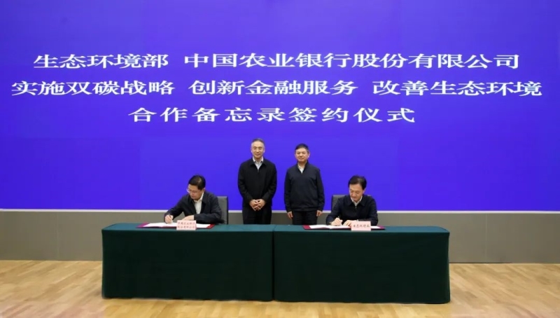 11月16日,生态环境部与中国农业银行股份有限公司(以下简称中国农业银行)在京签署《实施双碳战略 创新金融服务 改善生态环境合作备忘录》(以下简称合作备忘录)。生态环境部部长黄润秋,中国农业银行党委书记、董事长谷澍出席签约仪式并讲话。