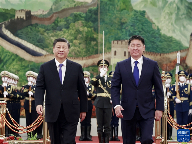 习近平欢迎呼日勒苏赫访华。习近平指出,我们时隔两月如约再次会面,充分体现了中蒙关系的高水平。中蒙互为重要邻国,保持中蒙长期稳定的睦邻友好合作关系,符合两国人民根本利益。中国坚持亲诚惠容理念和与邻为善、以邻为伴周边外交方针,高度重视深化中蒙友好互信和利益融合。双方携手抗疫,守望相助,弘扬了传统友谊。两国各领域交流合作不断走深走实,树立了国与国交往的典范。面对不稳定性不确定性日益上升的国际环境,中方愿同蒙方以构建两国命运共同体为引领,推动中蒙全面战略伙伴关系行稳致远,更好造福两国人民。