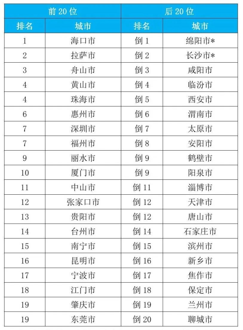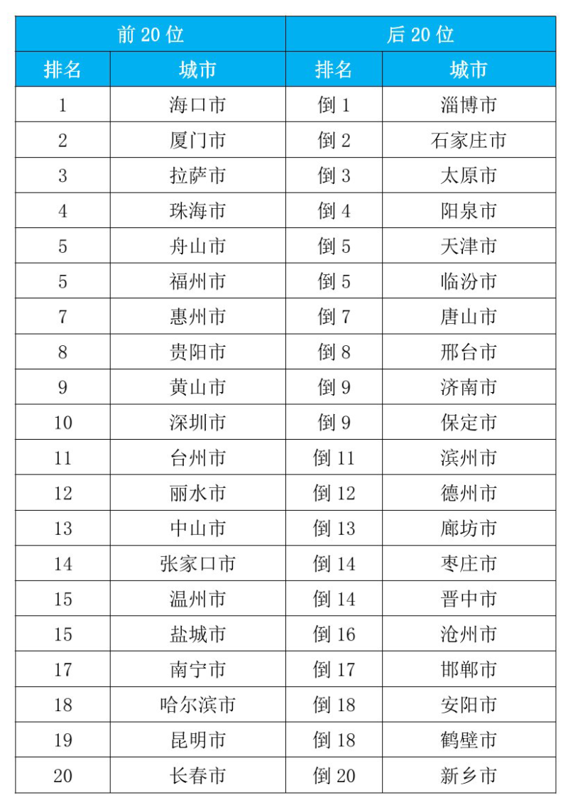9月,168个重点城市中,空气质量排名前20位城市依次是海口、厦门和拉萨等城市(从第1名至第20名);空气质量排名后20位城市依次是淄博、石家庄和太原等城市(从倒数第1名至倒数第20名)。见附表1。