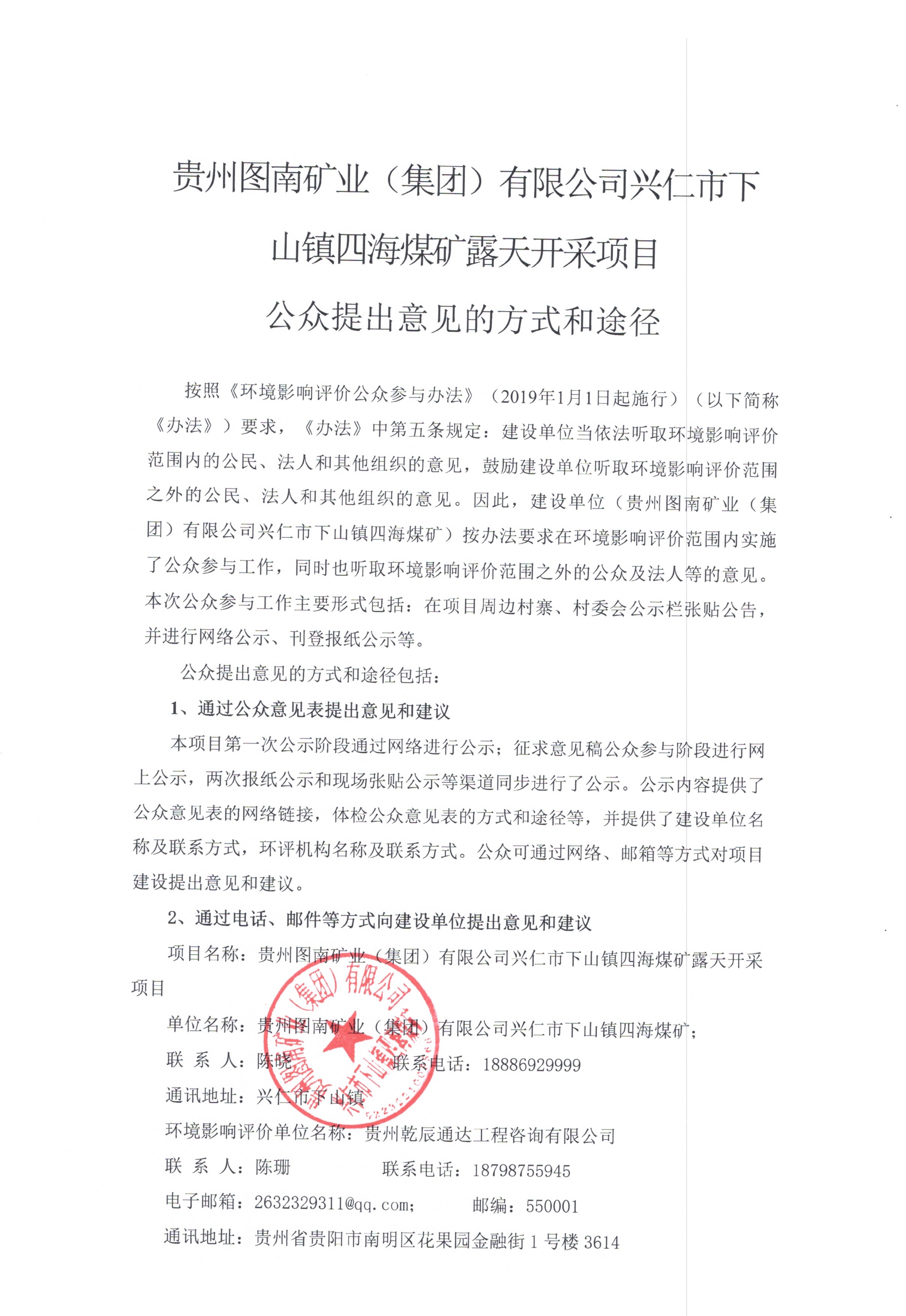 贵州图南矿业(集团)有限公司兴仁市下山镇四海煤矿露天开采项目环境影响报告书受理公示