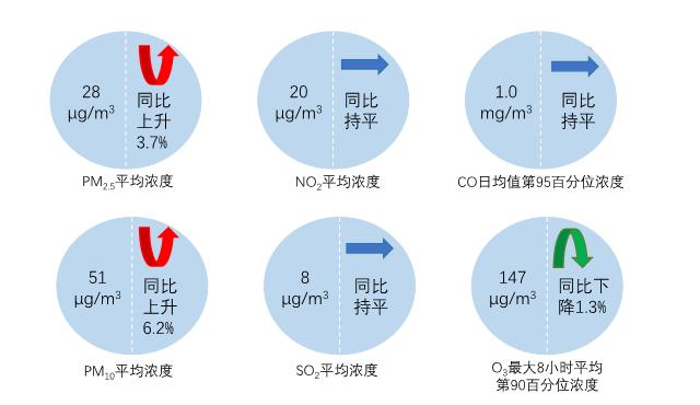 1—10月,全国339个地级及以上城市平均空气质量优良天数比例为85.1%,同比下降1.2个百分点,较2019年同期上升2.9个百分点;平均重度及以上污染天数比例为1.6%,同比上升0.8个百分点,较2019年同期下降0.1个百分点;PM2.5平均浓度为28微克/立方米,同比上升3.7%,较2019年同期下降17.6%;O3平均浓度为147微克/立方米,同比下降1.3%,较2019年同期下降2.6%;PM10平均浓度为51微克/立方米,同比上升6.2%;SO2平均浓度为8微克/立方米,同比持平;NO2平均浓度为20微克/立方米,同比持平;CO平均浓度为1.0毫克/立方米,同比持平。