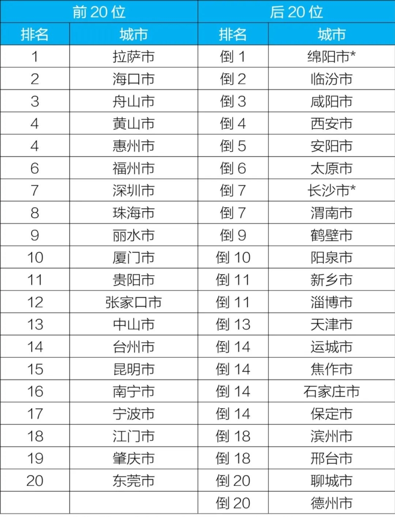 1—10月,168个重点城市中,空气质量排名前20位城市依次是拉萨、海口和舟山等城市(从第1名至第20名);空气质量排名后20位城市依次是绵阳、临汾和咸阳等城市(从倒数第1名至并列倒数第20名)。其中,绵阳市科技城新区的高新区自来水公司站点4月和5月、长沙市开福区的伍家岭站点6月受到严重人为干扰,对所在城市当月六项污染物浓度进行了最大值替代处理。见附表2。