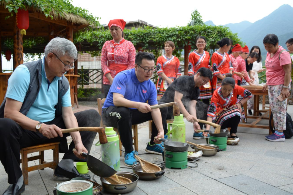 游客在故乡茶博园体验打油茶(图片来源:昭平县文化广电和旅游局)