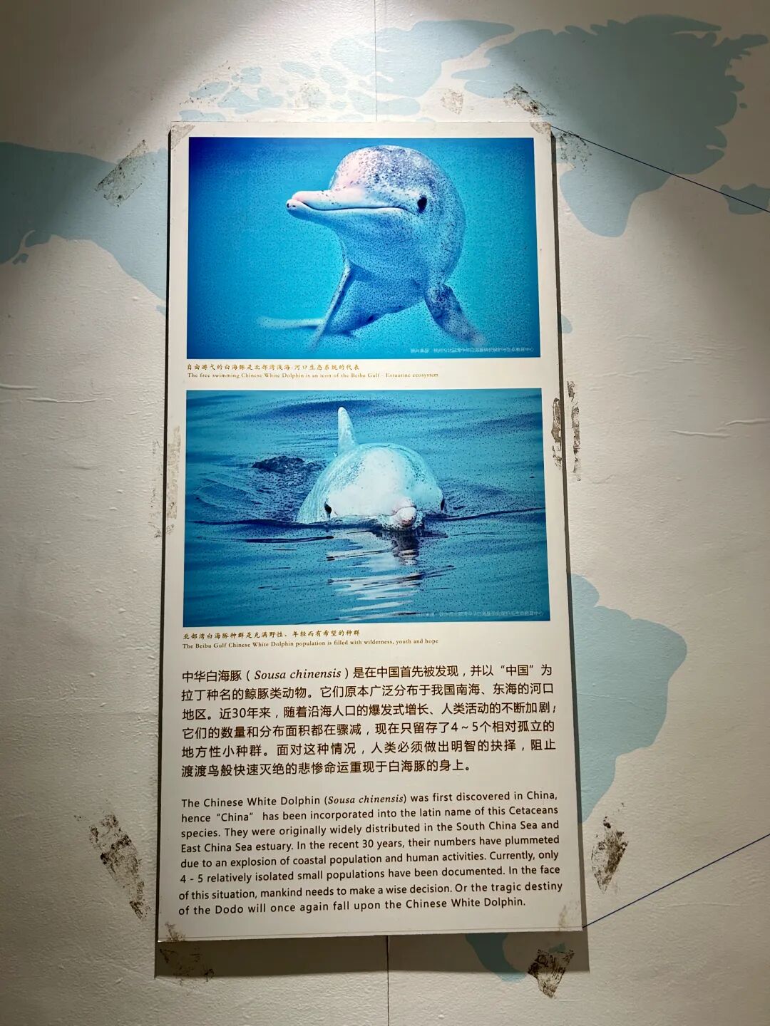 三娘湾,位于北部湾顶端,距离广西钦州市区大约40千米。这里的渔民,家门前就是大海,咸湿的海风每日都能带来大海的气息。渔民在这里安居乐业,中华白海豚也在这里繁衍生息。而这都离不开三娘湾海域富饶的渔业资源。“三娘湾浅海—河口生态系统中丰富的生物多样性维持着这个系统的完整性和稳定性。这里是白海豚的自然庇护所,也是北部湾甚至整个南海生物的繁衍场和育幼场。” 北京潘文石生物多样性研究中心主任兼研究员赵一向采风团介绍道。广西钦州三娘湾,是我国海域范围内能见到中华白海豚数量较多的地方之一。作为我国独有的物种,中华白海豚有着重要的生物价值。“中华白海豚是这片海域的旗舰物种,它的存在代表着这片海域的生态系统是稳定健康的。如果有一天,我们在这片海域再也看不到它,也就证明这片海域的生命之链有一环中断了,人类也将面临危机。” 赵一说道。在三娘湾的中华白海豚科普馆,展示墙上的一段话引起了采风团的关注:每一个物种都有一段漫长的演化历史。人类永远不可能让著名的渡渡鸟重现于地球,除非乾坤倒转,宇宙重来。