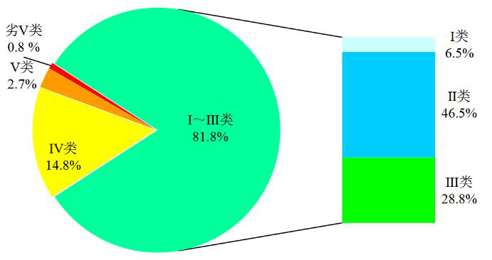 2020年1-10月,1940个国家地表水考核断面中,水质优良(Ⅰ-Ⅲ类)断面比例为81.8%,同比上升6.4个百分点;劣Ⅴ类断面比例为0.8%,同比下降2.4个百分点。主要污染指标为化学需氧量、总磷和高锰酸盐指数。
