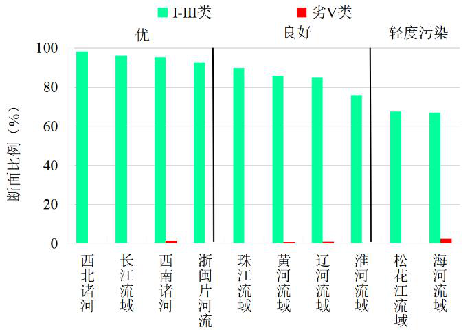 图4 2020年1-10月七大流域和西南、西北诸河及浙闽片河流水质类别比例