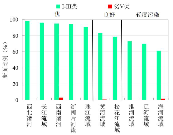 2020年1-10月,长江、黄河、珠江、松花江、淮河、海河、辽河等七大流域及西北诸河、西南诸河和浙闽片河流Ⅰ-Ⅲ类水质断面比例为85.6%,同比上升6.2个百分点;劣Ⅴ类为0.4%,同比下降2.6个百分点。主要污染指标为化学需氧量、高锰酸盐指数和总磷。其中,西北诸河、长江流域、西南诸河、浙闽片河流和珠江流域水质为优,黄河和松花江流域水质良好,淮河、辽河和海河流域为轻度污染。