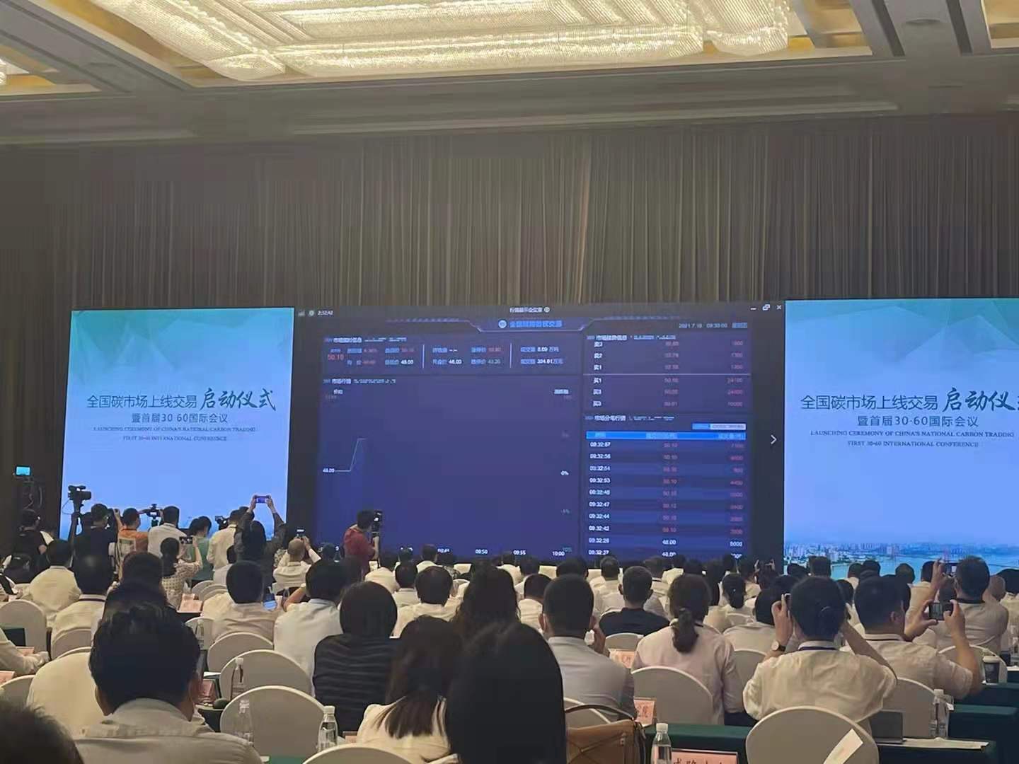 全国碳市场上线交易启动会由生态环境部党组书记孙金龙主持,9点30分,韩正副总理宣布全国碳市场上线交易正式启动。全国碳排放权交易面板显示,首笔碳配额开盘价为48元/吨,碳交易撮合成功价格为52.78元/吨,总成交16万吨,交易额为790万元。