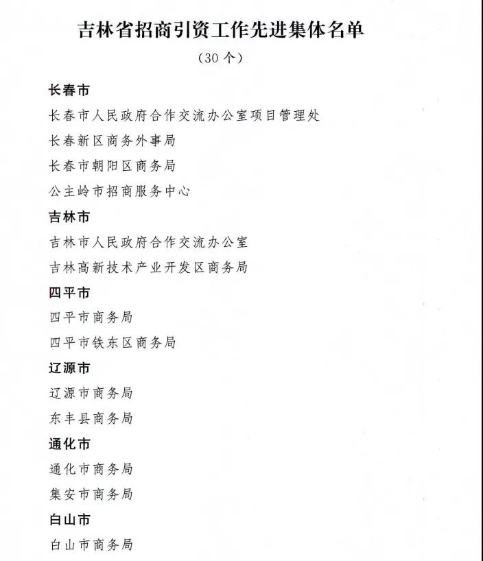 近年来,各地各部门特别是招商引资战线广大干部职工以习近平总书记视察吉林重要讲话重要指示精神为统领,认真贯彻落实省委、省政府关于招商引资工作的各项决策部署,紧盯重点项目,压实招商活动,突出项目引进,强化企业服务,较好地完成了招商引资工作任务,为推动吉林全面振兴全方位振兴作出了重要贡献。同时,涌现出一大批成绩显著的招商引资工作先进集体和先进个人。