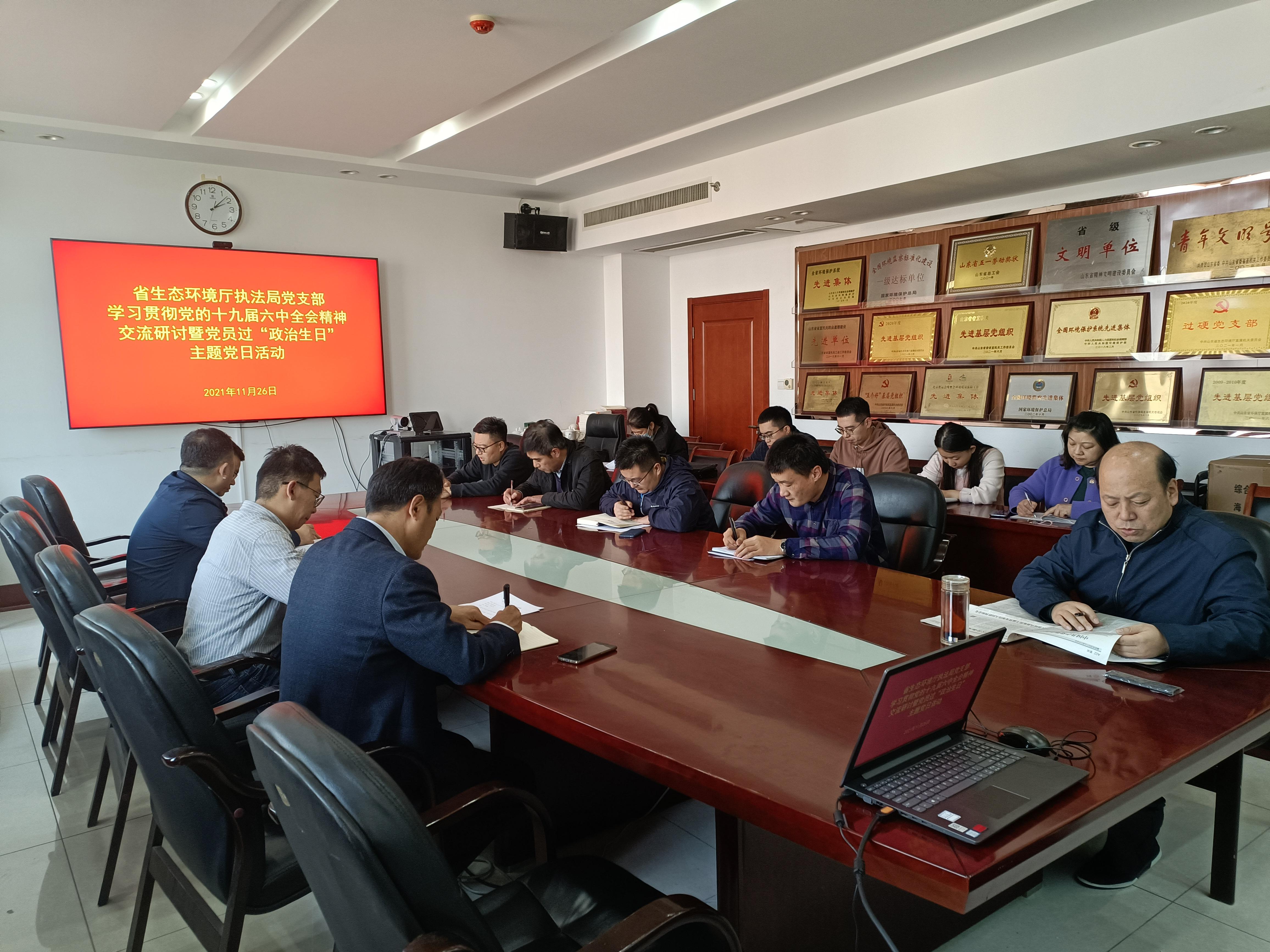 2021年11月26日,省生态环境厅执法局党支部组织开展学习贯彻党的十九届六中全会精神交流研讨暨党员过“政治生日”主题党日活动。