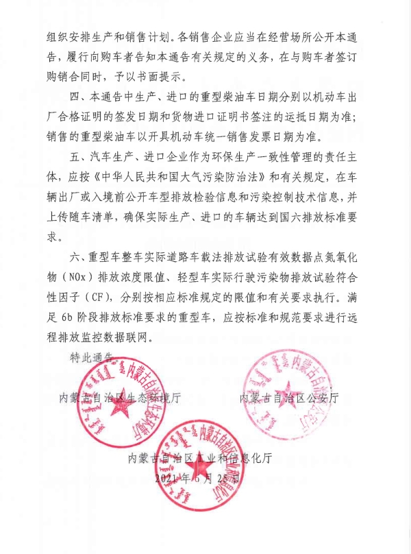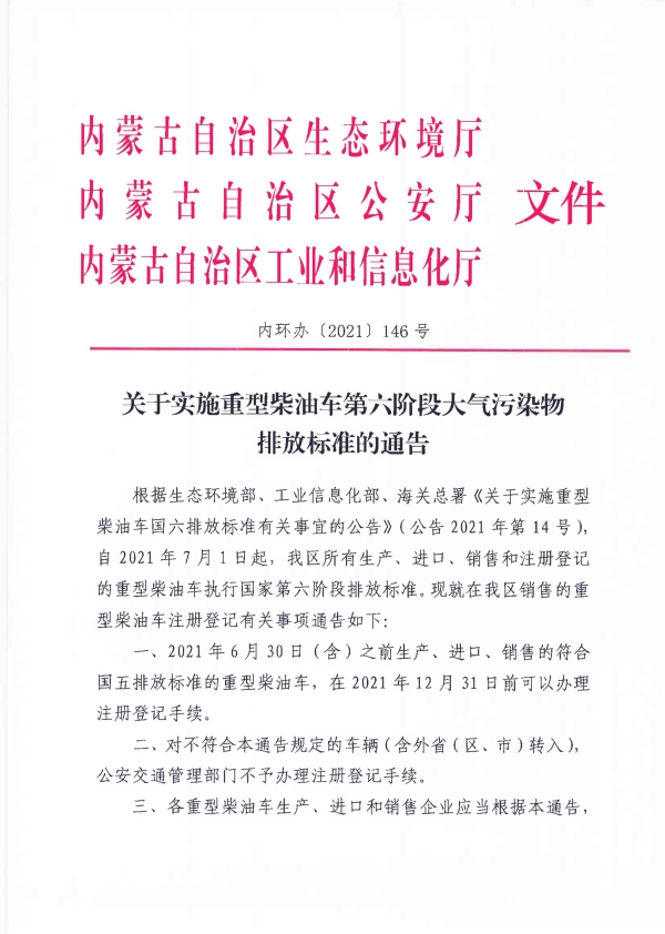 内蒙古自治区生态环境厅 公安厅 工业和信息化厅关于实施重型柴油车第六阶段大气污染物排放标准的通告