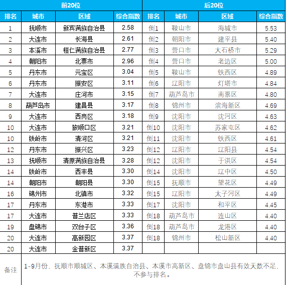 2021年1-9月辽宁省105个区县排名前20位和后20位区县名单