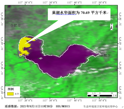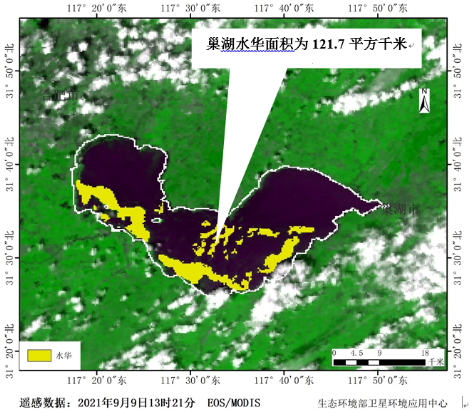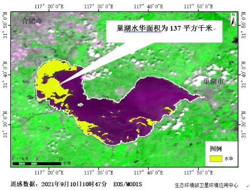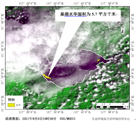 0 | 无水华 | 9月8日,巢湖水域水华面积约5.7平方千米,主要分布在南部沿岸和东部湖区,占巢湖水域面积比例为0.7%,水华特征为“无明显水华”。9月9日,巢湖水域水华面积121.7平方千米,在西部沿岸、南部沿岸、东南部和湖心区域均监测到水华,占巢湖水域面积的15%,水华特征为“轻度水华”。9月10日,巢湖水域水华面积137平方千米,在西部、南部、东南部和湖心区域均监测到水华,占巢湖水域面积的17.98%,水华特征为“轻度水华”。9月11日,巢湖水域水华面积约70.69平方千米,主要分布在西部区域,占巢湖水域面积的9%,水华特征为“无明显水华”。9月6日、7日及12日,巢湖水域水华特征均为“无水华”。 |