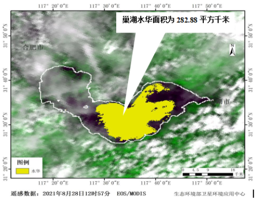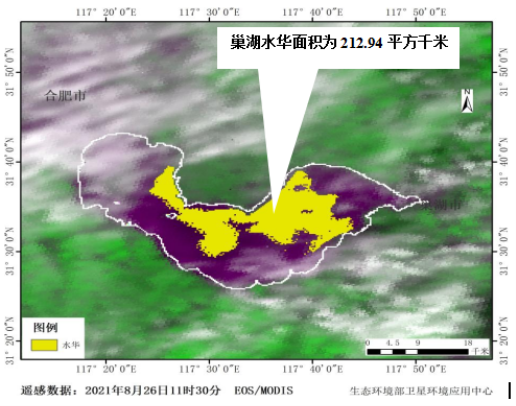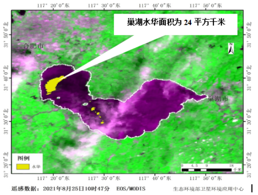 0 | 无水华 | 8月25日,巢湖水域水华面积24平方千米,主要分布在西半湖西部区域,占巢湖水域面积的3%,水华特征为“无明显水华”。8月26日,巢湖水域水华面积约212.94平方千米,主要分布在北部沿岸、中部和东部区域,占巢湖水域面积的28%,水华特征为“轻度水华”。8月28日,巢湖水域水华面积约282.88平方千米,主要分布在中部和东部湖区,占巢湖水域面积比例为37%,水华特征为“中度水华”。8月23-24日、27日及29日,巢湖水域水华特征均为“无水华”。