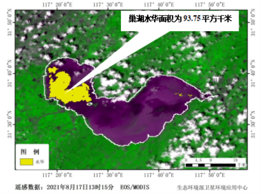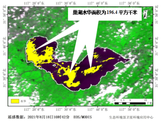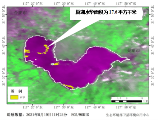 0 | 无水华 | 8月17日—18日,巢湖水域水华面积分别约93.75平方千米和196.4平方千米,在西部、中部、东部区域均监测到水华,分别占巢湖水域面积的12.3%和25.8%,水华特征均为“轻度水华”。8月19日,巢湖水域水华面积约17.6平方千米,主要分布在西半湖湖心、西部沿岸和东半湖南部沿岸区域,占巢湖水域面积的2.3%,水华特征为“无明显水华”。8月16日和20日—22日,巢湖水域水华特征均为“无水华”。 |