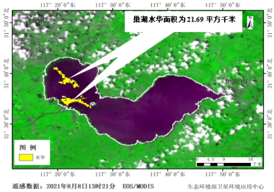 8月2日—7日巢湖水域部分云或无云覆盖,未监测到有效水华。 8月8日,巢湖水域水华面积约21.69平方千米,主要分布在西半湖北部沿岸和东半湖南部沿岸区域,占巢湖水域面积的2.8%,水华特征为“无明显水华”。 |