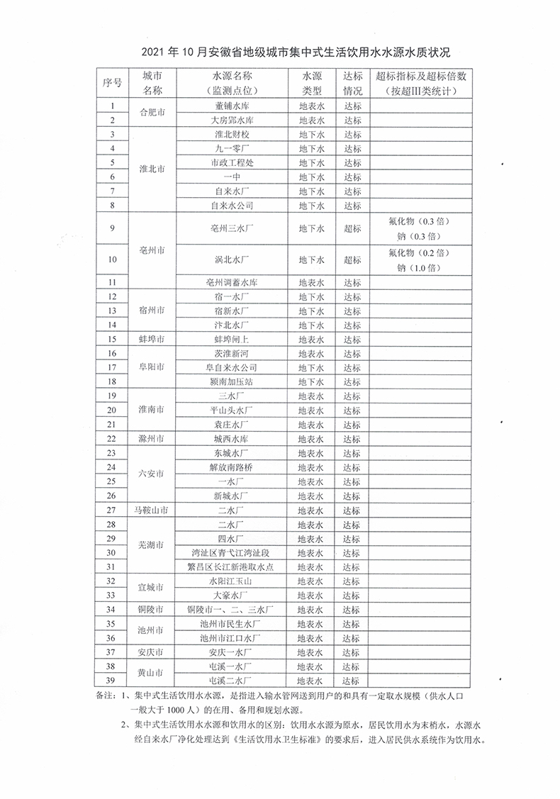 附件:安徽省地级城市集中式生活饮用水水源水质状况(2021年10月).docx