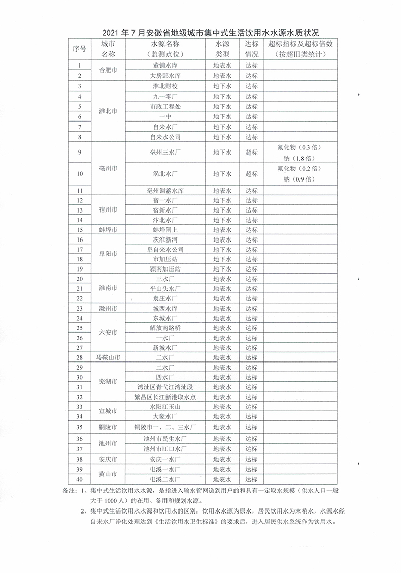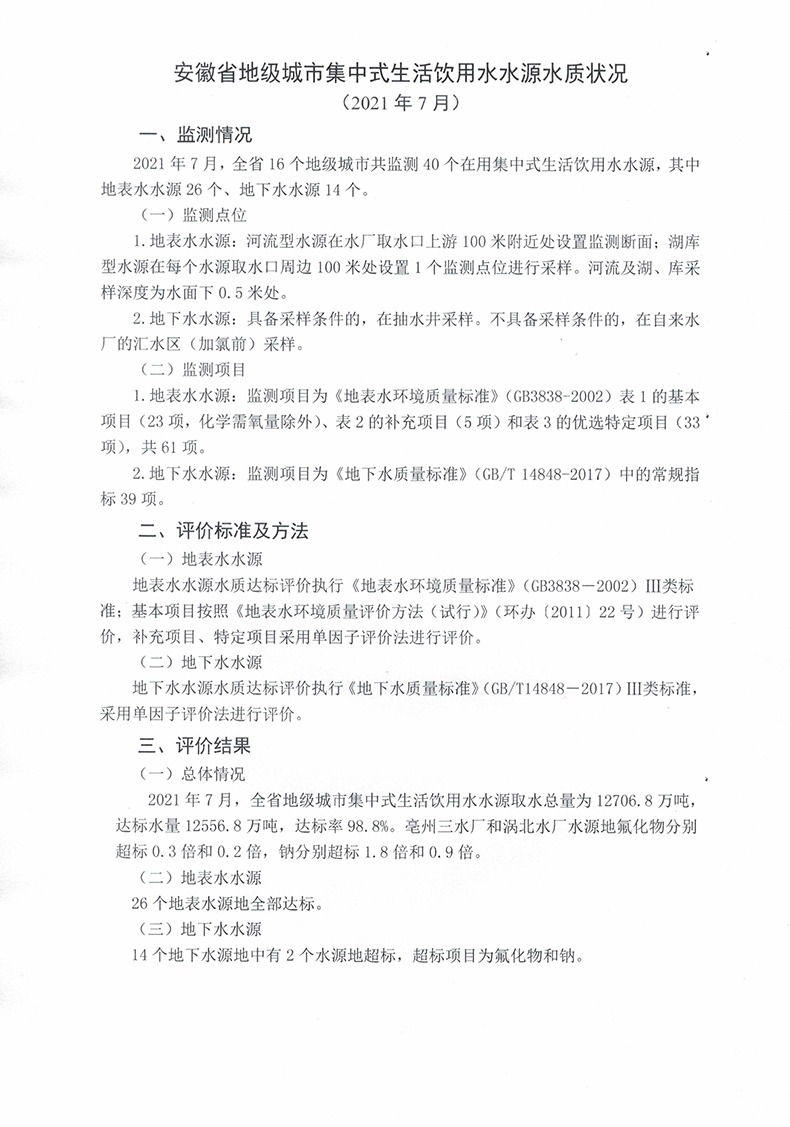 附件:安徽省地级城市集中式生活饮用水水源水质状况(2021年7月).docx