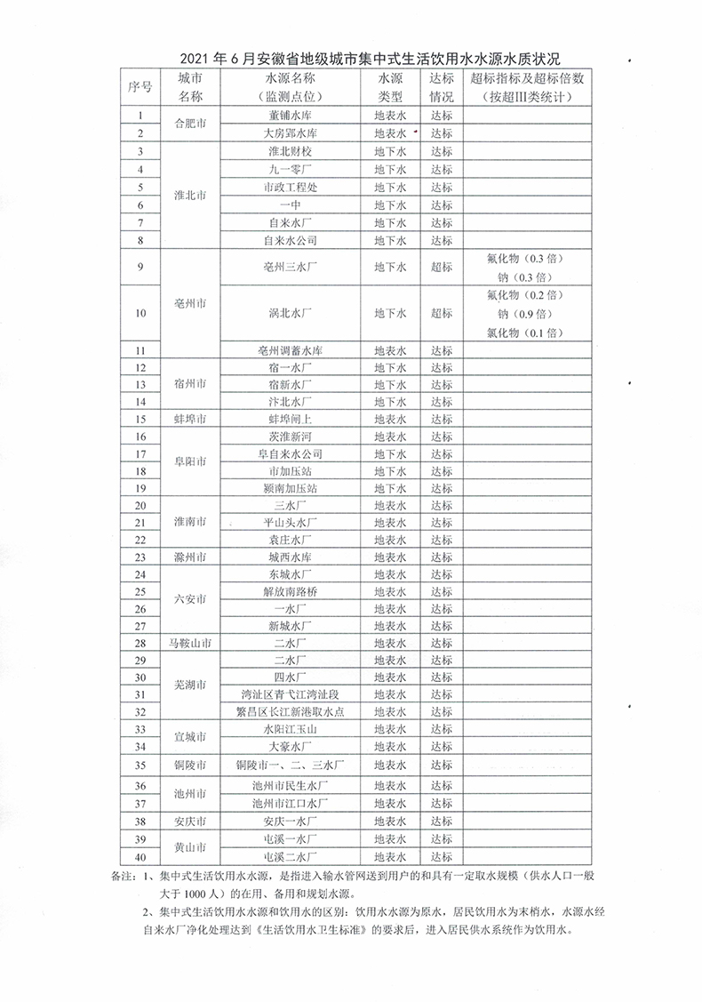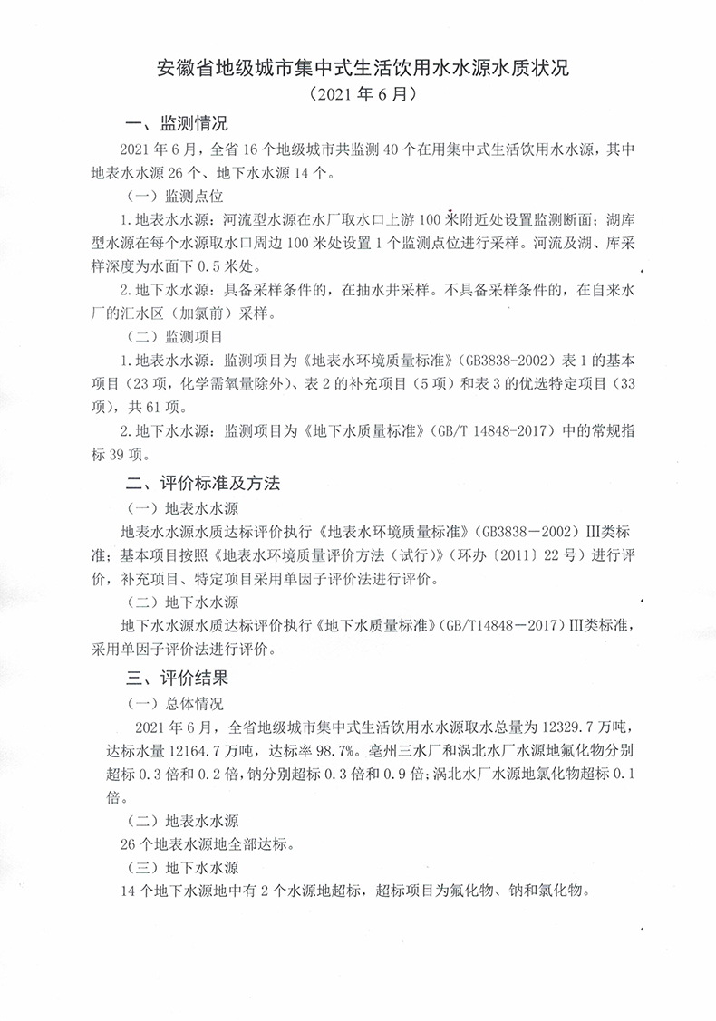 附件:安徽省地级城市集中式生活饮用水水源水质状况(2021年6月).docx