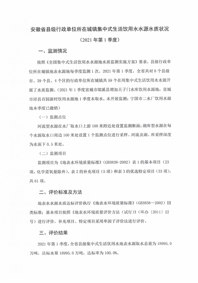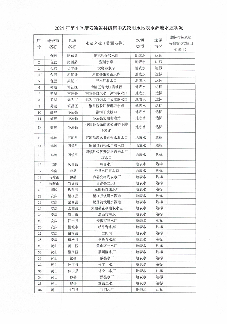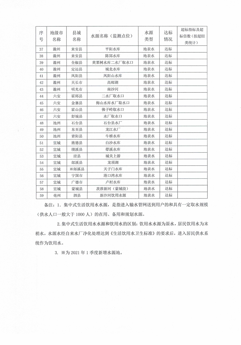安徽省县级行政单位所在城镇集中式生活饮用水水源水质状况(2021年第1季度)