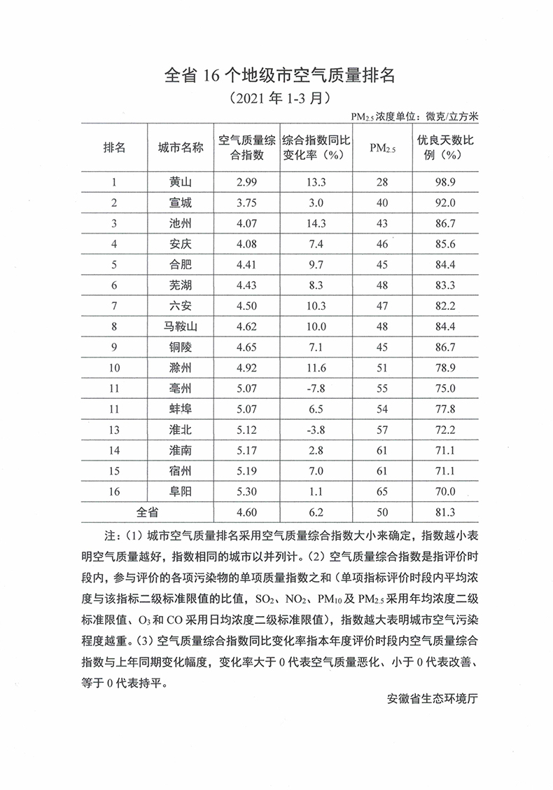 全省16个地级市空气质量排名(2021年1-3月)