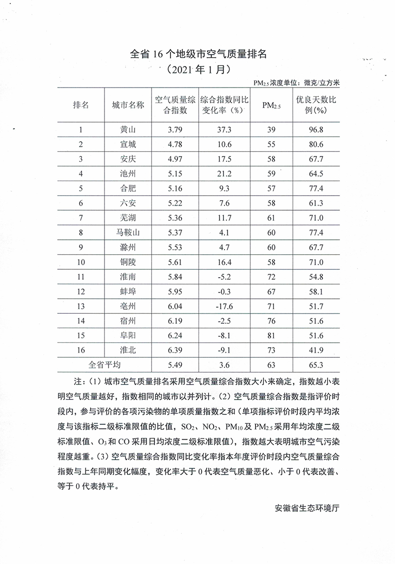 全省16个地级市空气质量排名(2021年1月)