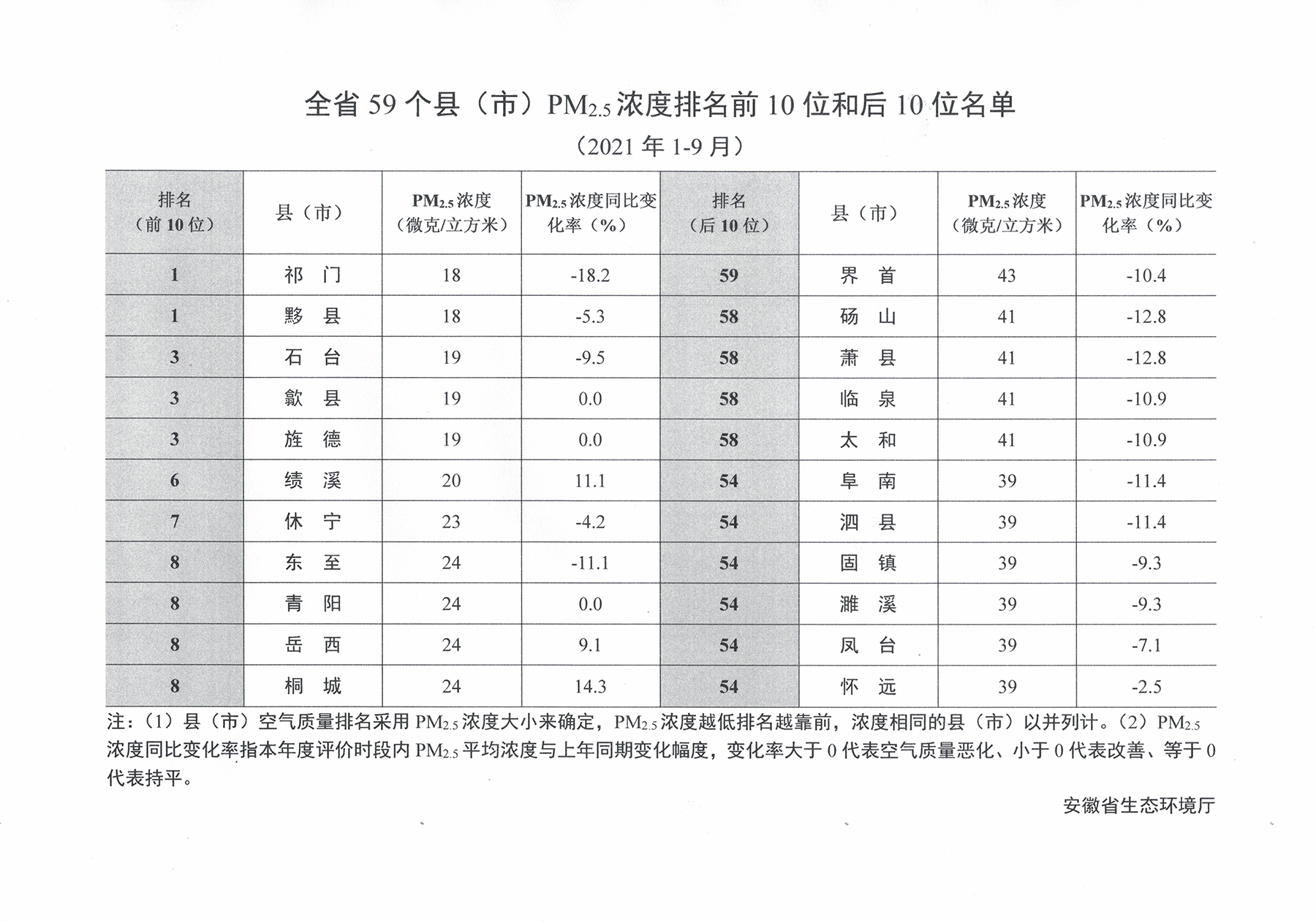 全省59个县(市)PM2.5浓度排名前10位和后10位名单(2021年1-9月)