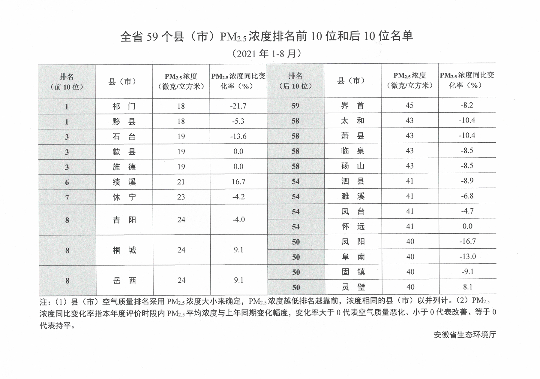 全省59个县(市)PM2.5浓度排名前10位和后10位名单(2021年1-8月)