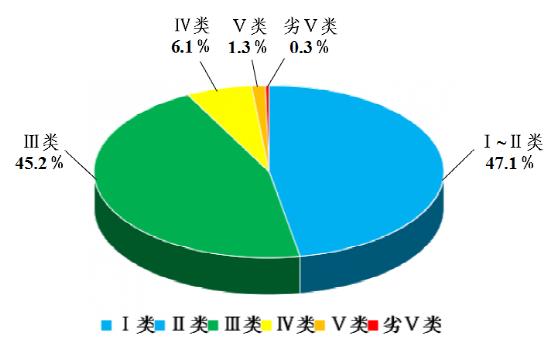 2022年1月,全省主要流域总体水质为优。监测的375个断面中,Ⅰ~Ⅲ类水质比例92.2%,其中Ⅰ~Ⅱ类水质比例47.1%。各类水质比例如下:Ⅰ类占5.1%,Ⅱ类占42.0%,Ⅲ类占45.2%,Ⅳ类占6.1%,Ⅴ类占1.3%,劣Ⅴ类占0.3%。