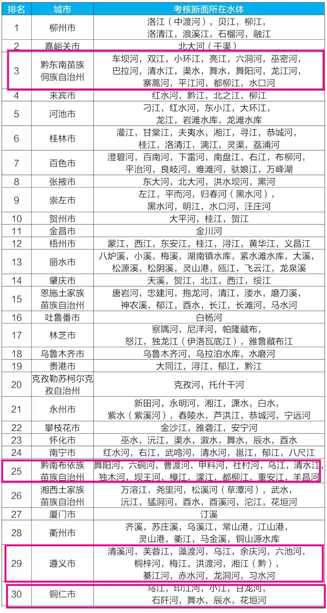 水环境质量上榜的贵州4个城市中,黔东南州上榜的河流包括车坝河、双江、小环江、亮江、六洞河、巫密河、巴拉河、清水江、渠水、舞水、舞阳河、龙江河、寨蒿河、平江河、都柳江和水口河。黔南州上榜的河流包括舞阳河、六硐河、曹渡河、甲料河、社村河、乌江、清水江、独木河、坝王河、樟江、濛江、都柳江、重安江和羊昌河。遵义市上榜的河流包括清溪河、芙蓉江、藻渡河、乌江、余庆河、六池河、桐梓河、梅江、洪渡河、湘江(黔)、綦江河、赤水河、龙洞河和习水河。铜仁市上榜的河流包括乌江、印江河、小江、甘龙河、石阡河、舞水、辰水和花垣河。