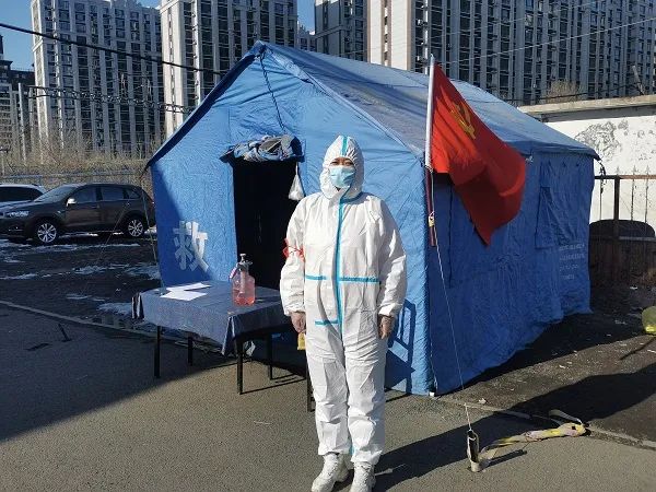 第一次上岗,没有抗疫经验的她面临的第一个难题是穿着防护装备,由于身高1.77米,穿着羽绒服就套不进防护服。在难题面前,她毅然决然地选择在零下五度飘着雪花的天气里,只穿着薄薄的单层抓绒衫,坚守在南厂宅社区核酸检测岗位。
