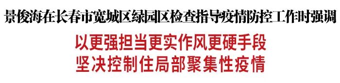 3月31日,省委书记景俊海到长春市宽城区、绿园区实地检查指导疫情防控工作。他强调,要深入贯彻习近平总书记关于疫情防控的重要讲话重要指示精神,按照孙春兰副总理部署要求,坚定信心、咬紧牙关、坚持到底,采取更加适应奥密克戎变异毒株传播特点的防控措施,以更强担当、更实作风、更硬手段,坚决控制住局部聚集性疫情。