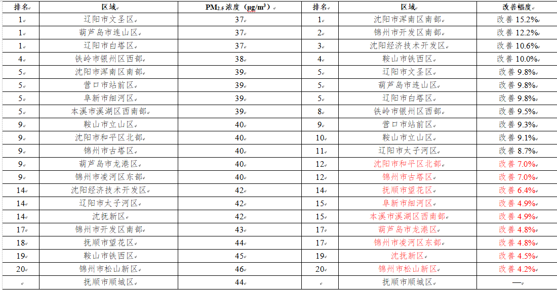 注:1、PM2.5浓度及改善幅度排名均为由好至差排名;抚顺市顺城区有效数据不足,不参与同比变化统计;