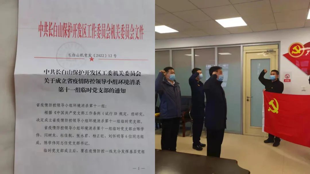 为发挥党组织战斗堡垒作用,敢于担当先锋,引导群众,凝聚力量,构筑疫情防控防线,经省环境消杀第十一组全体正式党员研究决定,报请中共长白山保护开发区工作委员会机关委员会,成立临时党支部,并得到批复,临时党支部由陈学伟同志任支部书记。
