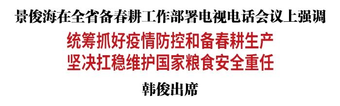 4月6日,省委书记景俊海主持召开全省备春耕工作部署电视电话会议。他强调,要深入贯彻习近平总书记关于疫情防控和保障粮食安全的重要讲话重要指示精神,统筹抓好疫情防控和备春耕生产,奋力实现粮食稳产增产、夺取全年丰收,坚决扛稳维护国家粮食安全重任。省委副书记、省长韩俊出席会议。